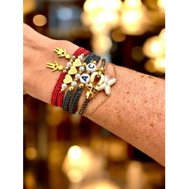 Un bracelet entièrement tressé à la main par mes soins, en fil de coton et perles MUM en acier inoxydable doré.